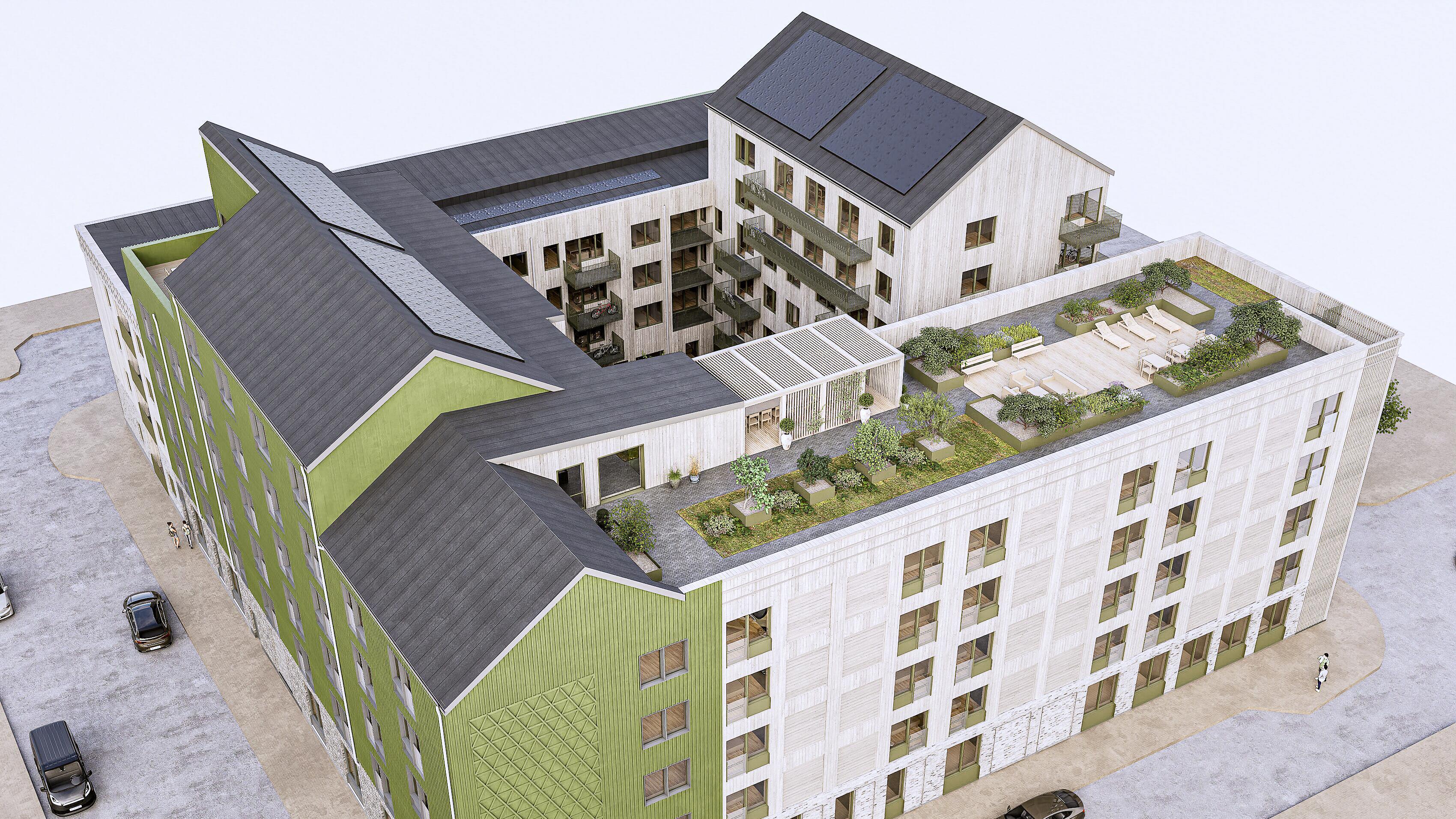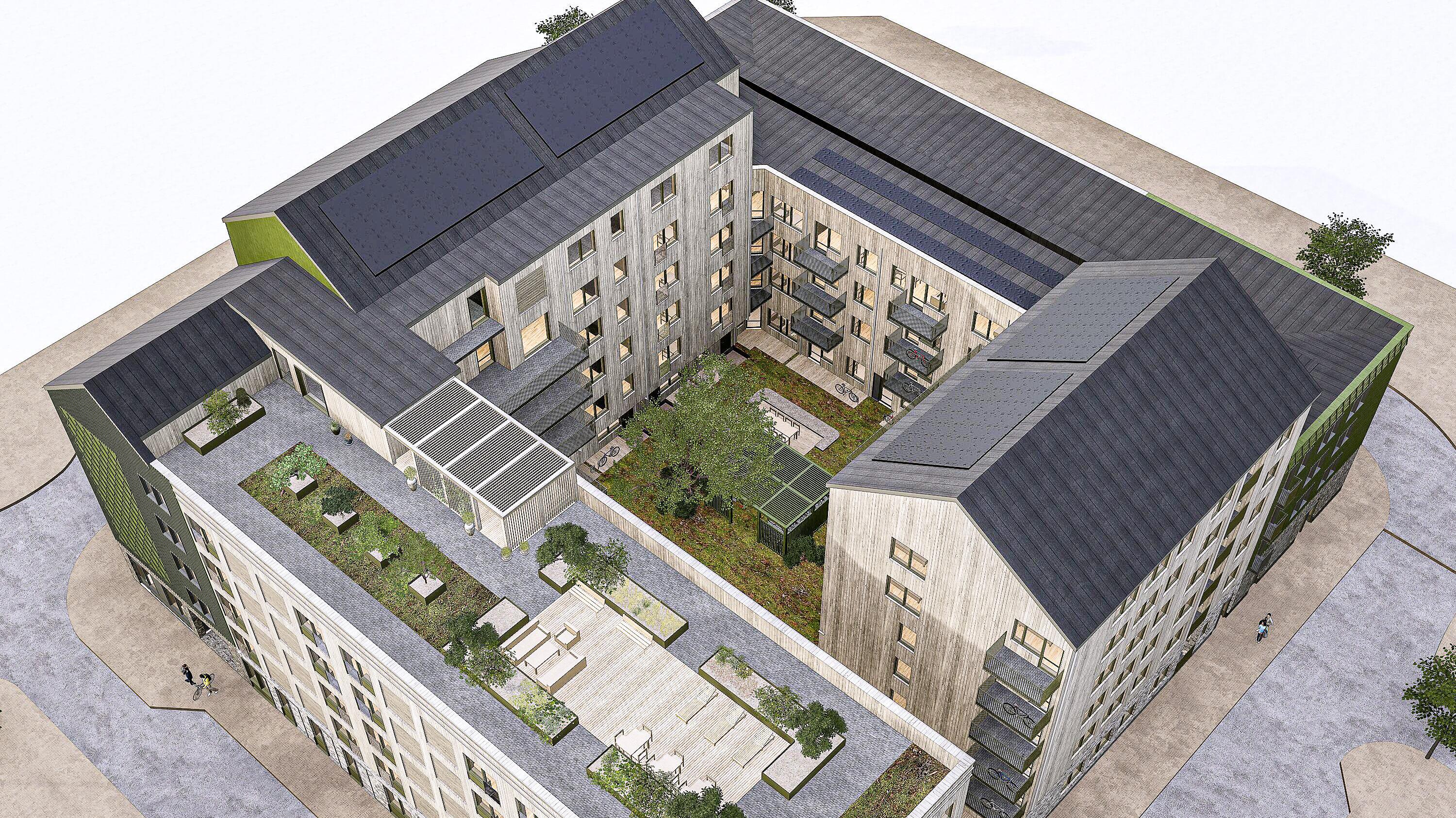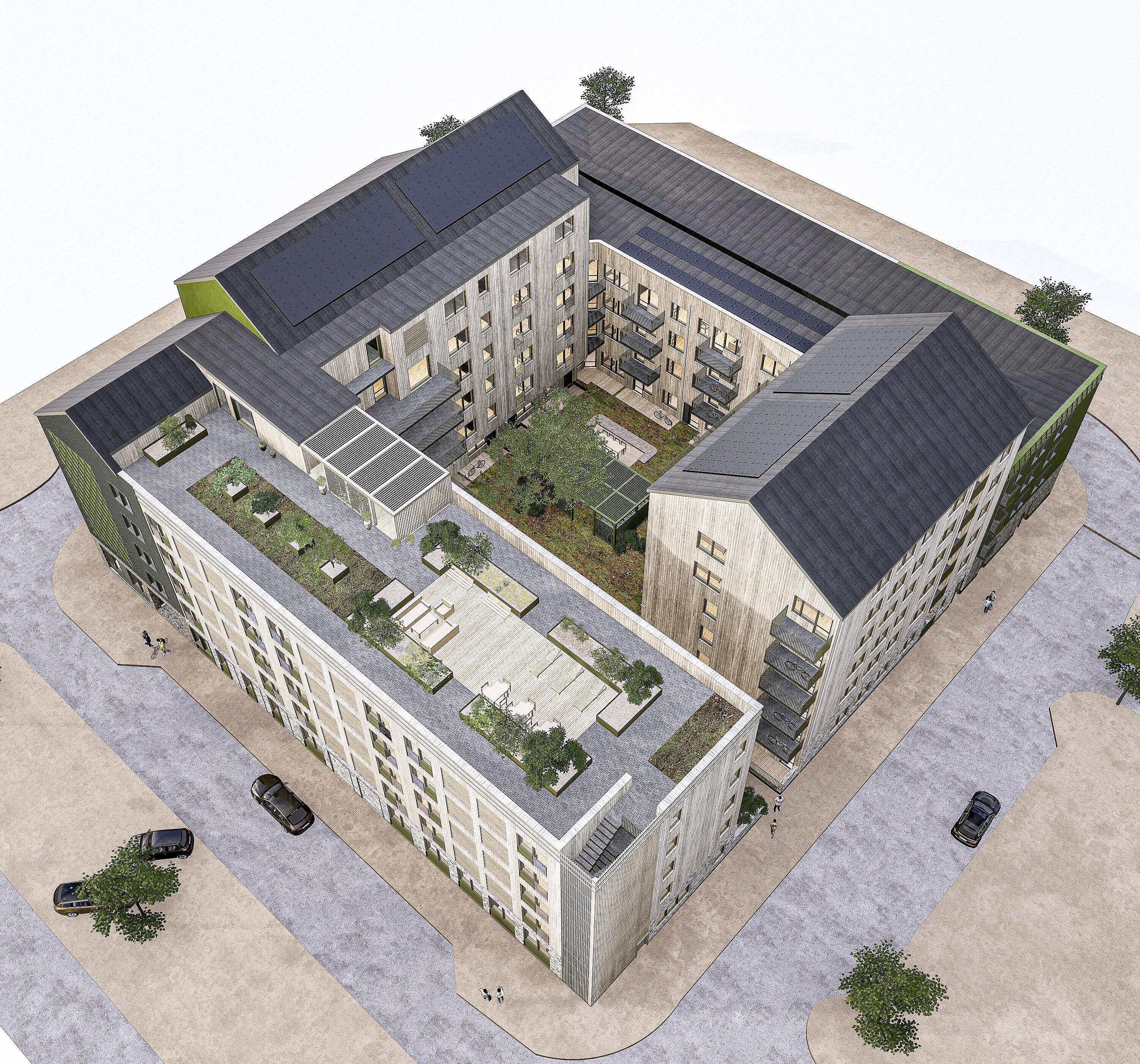 Byggnaden kommer att ha en vacker fasad i trä, solceller på taket, inslag av återbruk och kommer att miljömärkas med Svanen.