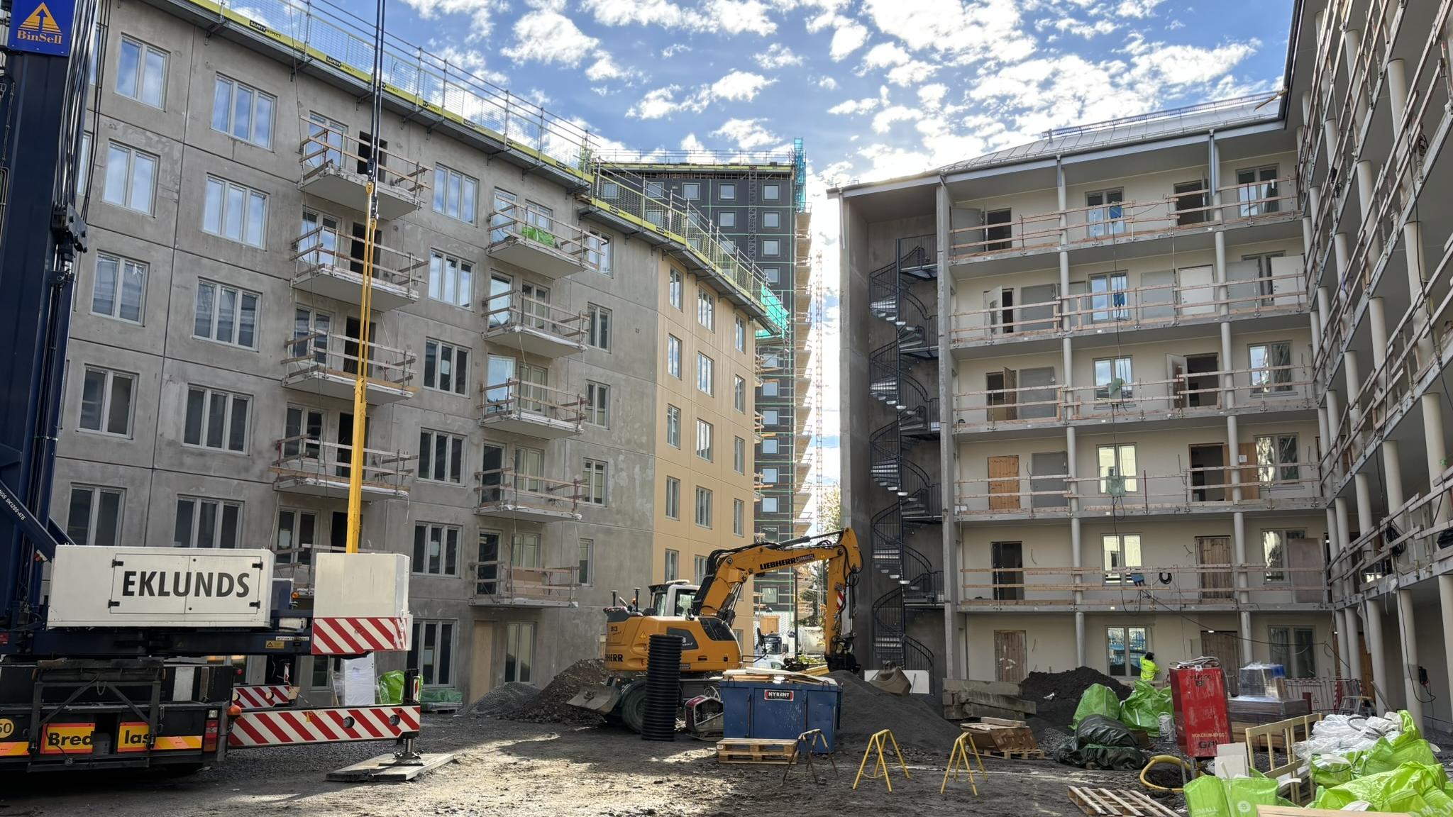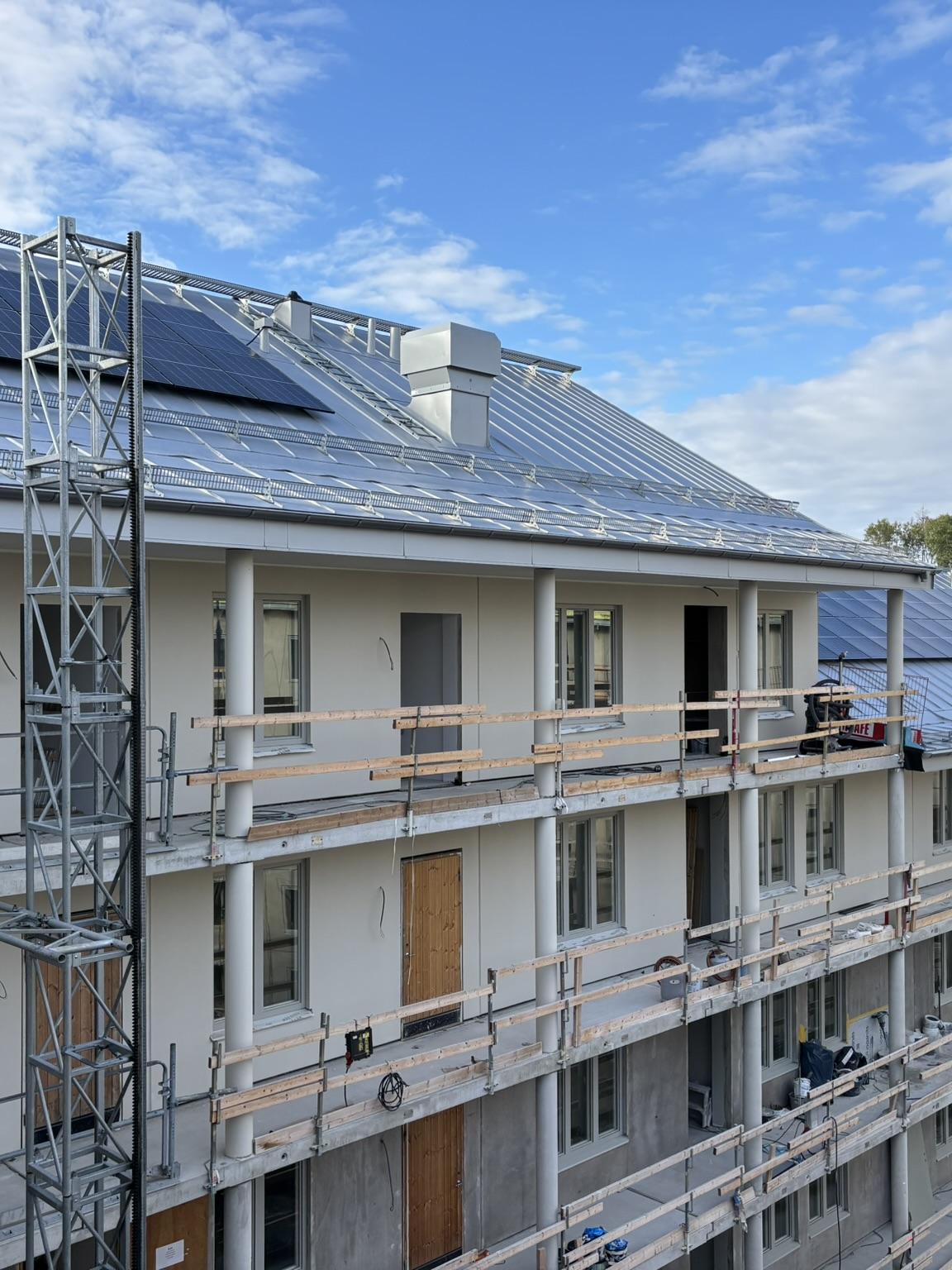 Bygget rullar vidare och nu är plåtarbeten igång! Vissa delar av huset har även börjat gipsas, särskilt på de nedersta våningarna. Någran mindre förändringar i projektet har skett, bland annat har vi projekterat ett större miljörum för att ännu bättre möta de boendes behov.