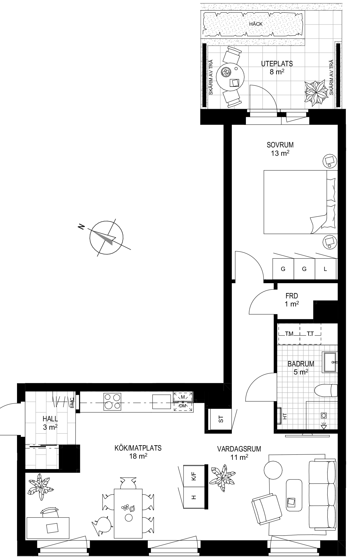 Välkommen att utforska ljusa, välplanerade lägenheter där öppna sociala ytor möter stora fönsterpartier och balkonger. I första säljettappen finns hem från 1 till 5,5 rum och kök, 27–111 kvm, inklusive två unika etagevåningar med egen takterrass. Se ett urval av planlösningarna nedan.