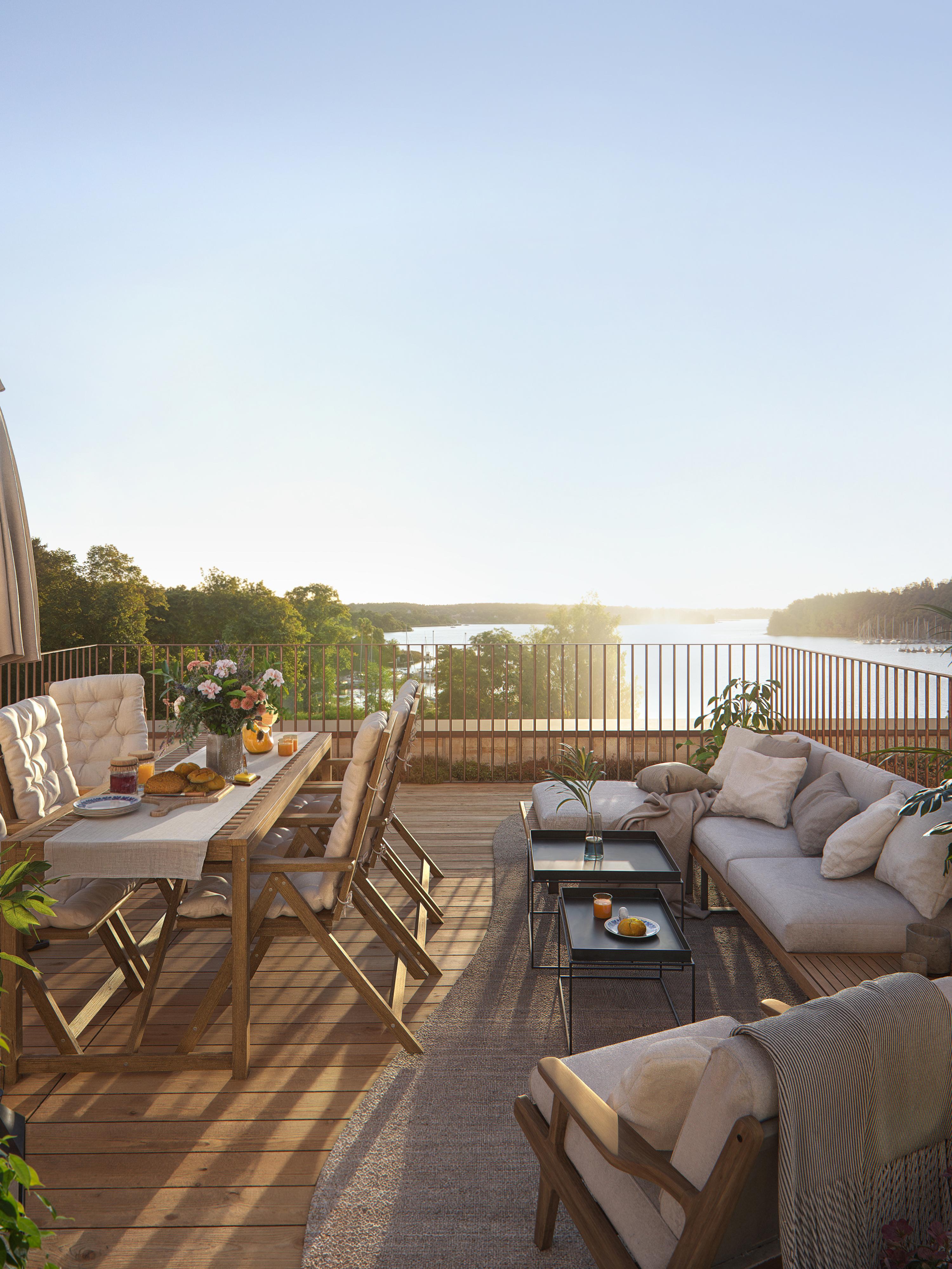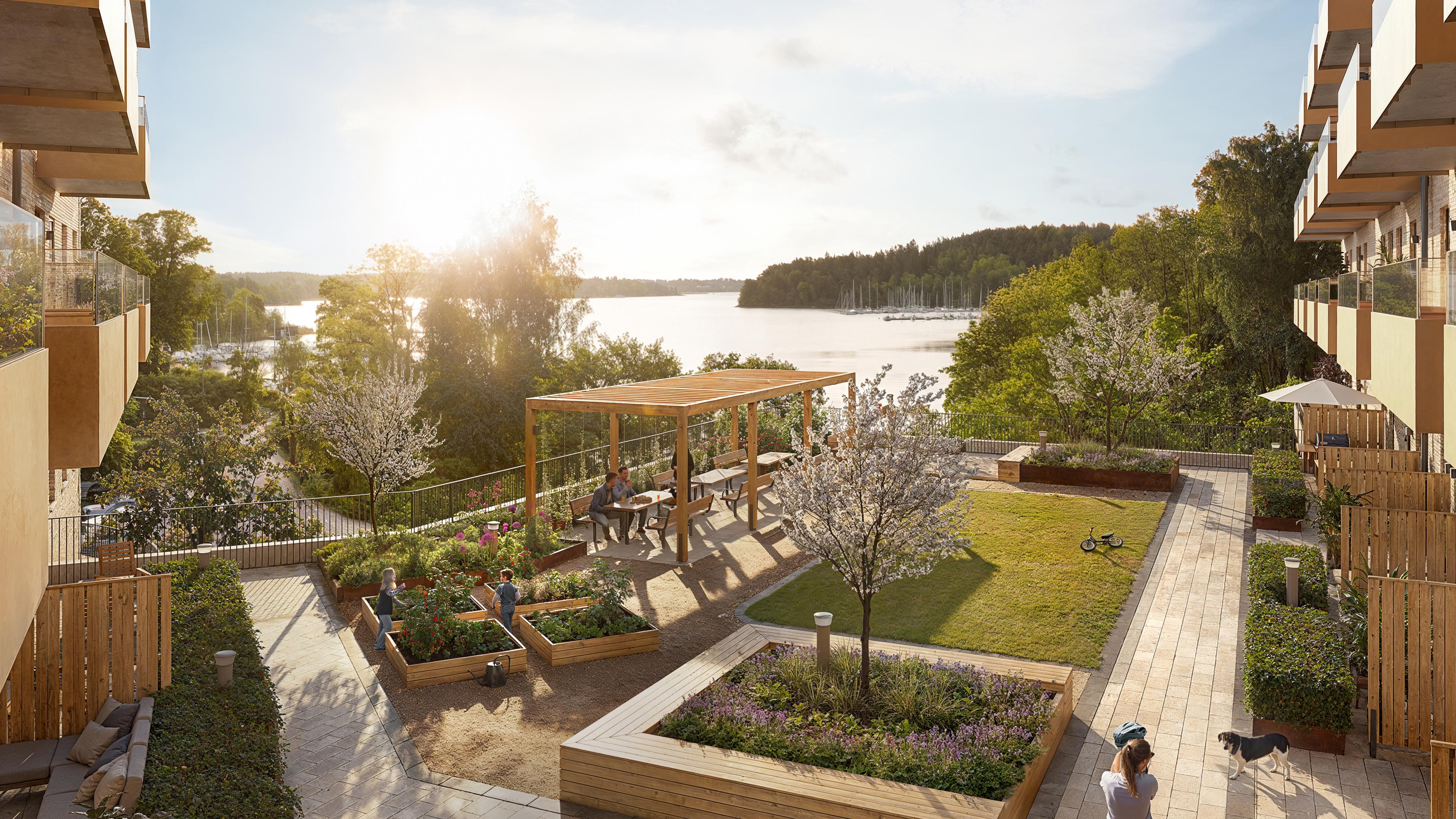 Tack vare att Sjöviken byggs ovanför vattennivån ges lägenheterna vyer med riktig skärgårdskänsla. Hela vägen ner till den gröna gården och lägenheterna på markplan som får sjöglimt mellan träden.