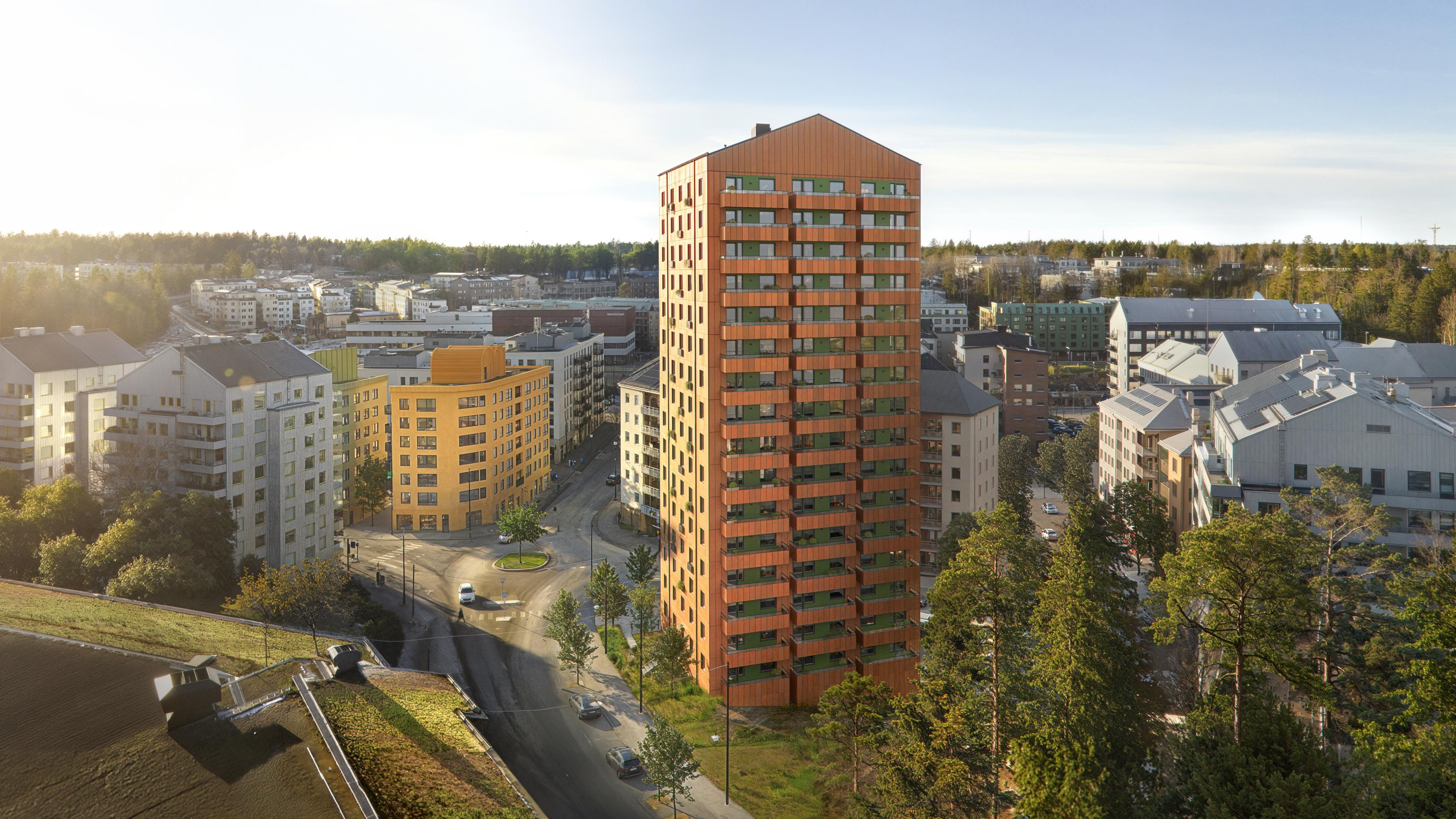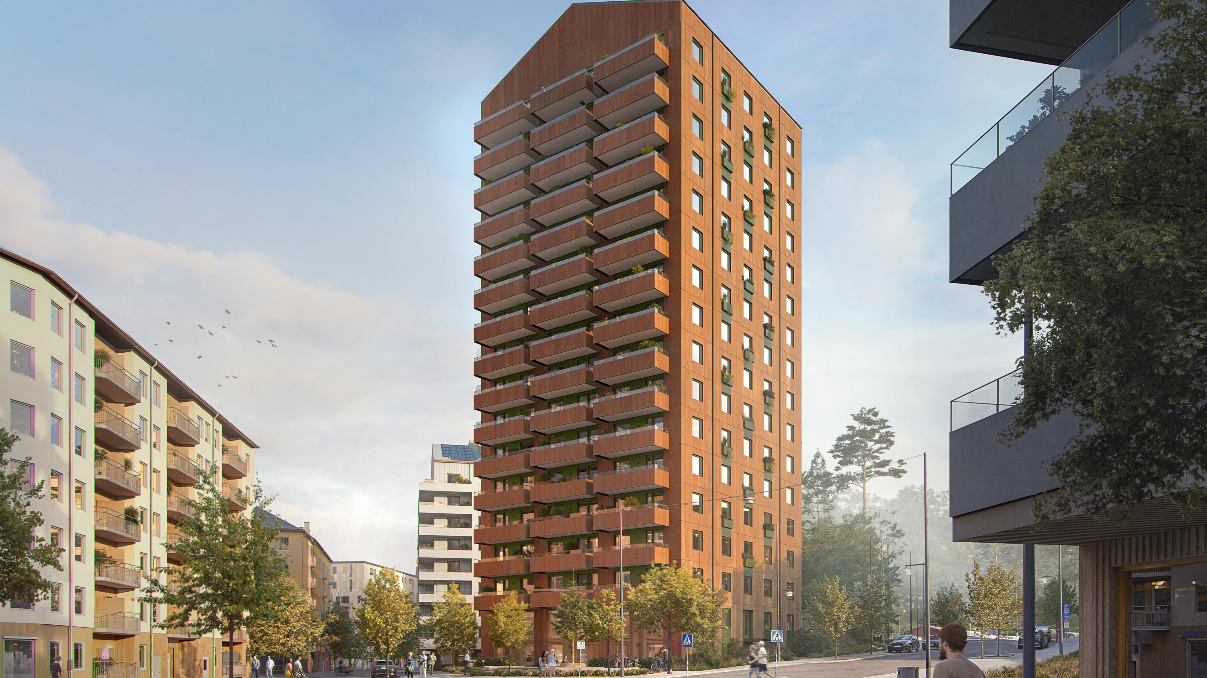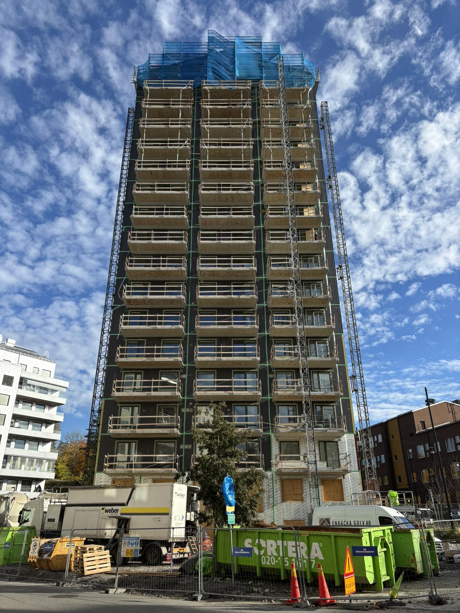 Nu är stommen och taket helt klara. Gipsning och målning pågår för fullt, fasaden monteras och flytspackling av golv är igång. Vi har även färdigställt visningslägenheten på våning 4.