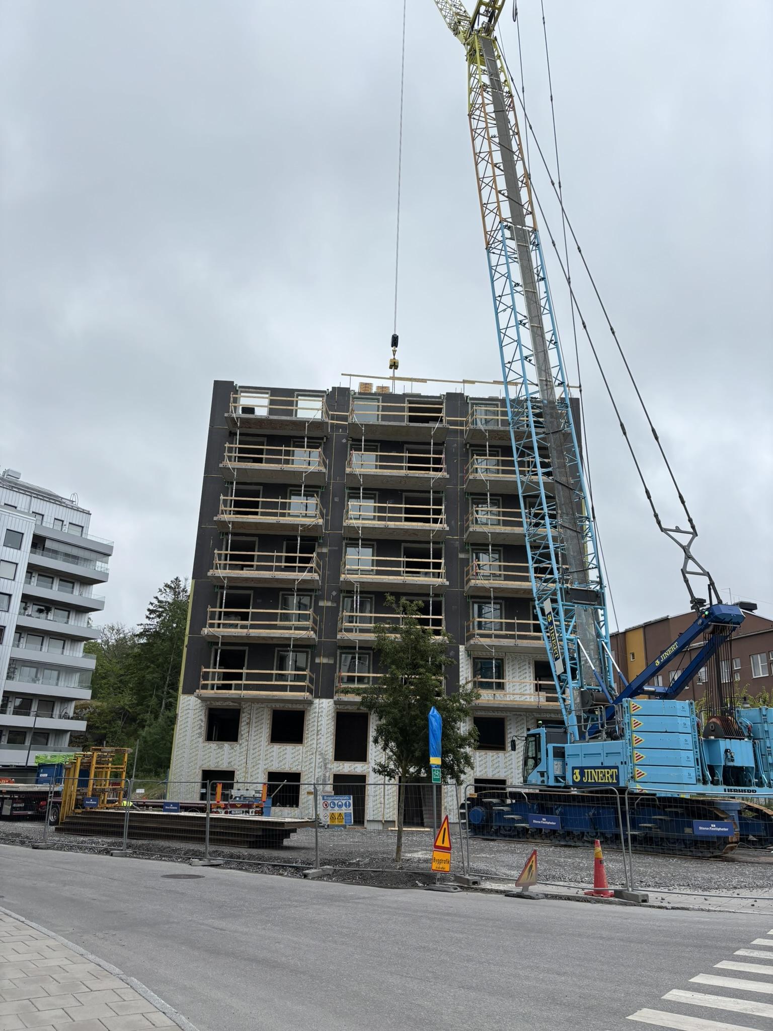 Stommen är nu rest och taket har kommit på plats. Huset är tätt upp till våning åtta och avfuktning pågår invändigt. Samtidigt har målning och gipsning startat på de första våningarna. Det är mycket aktivitet på bygget och vi håller tidsplanen.