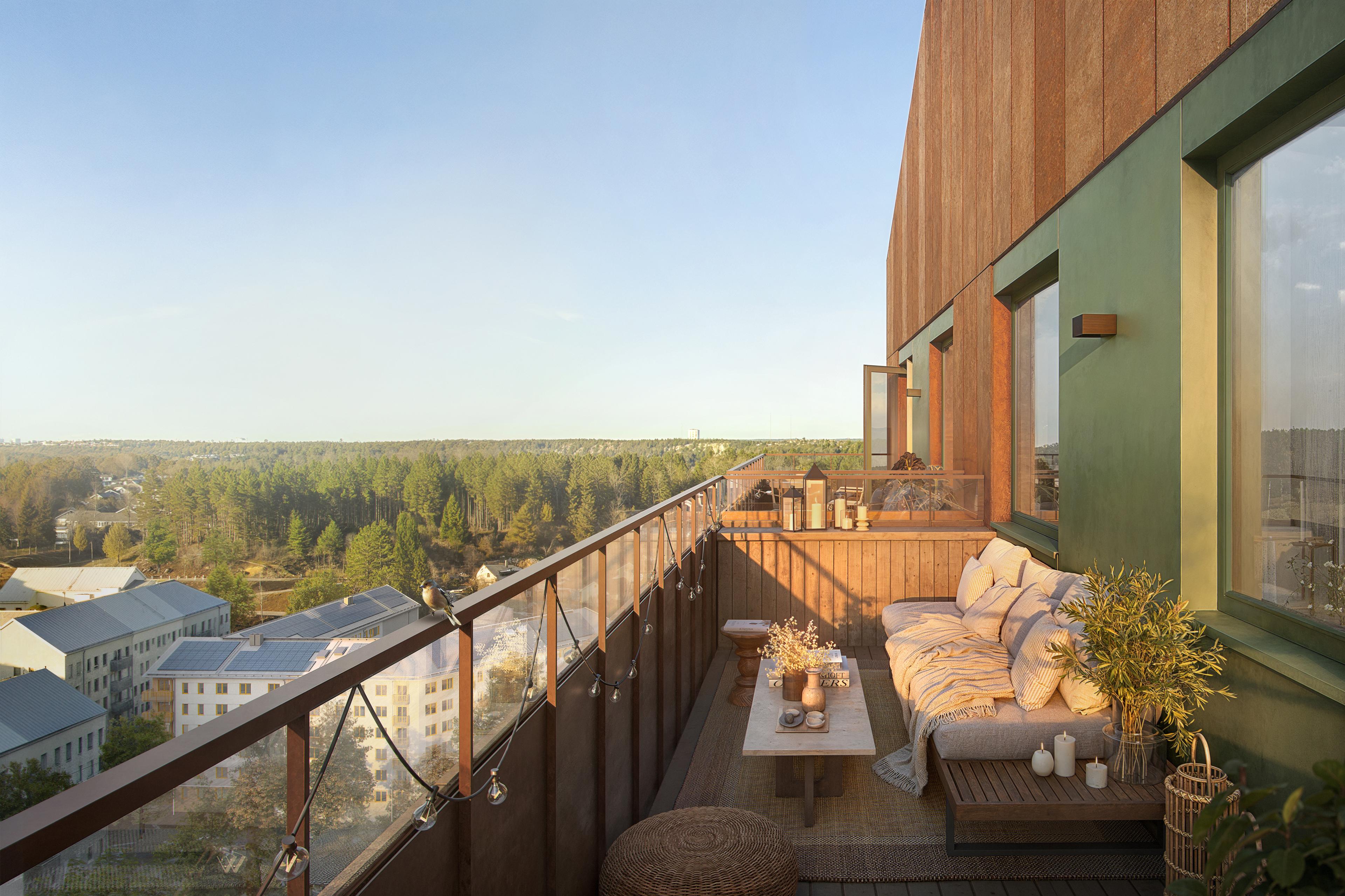 Alla lägenheter i Vyn har minst en generös balkong eller uteplats. Med nio rymliga kvadratmeter blir den ett extra rum, stort nog för både en loungehörna och en matgrupp.